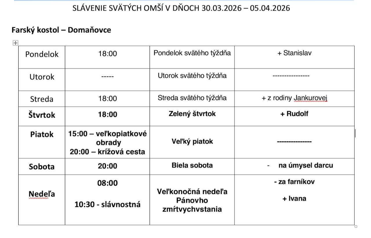 VEĽKÝ PIATOK (03.apríl) je deň Utrpenia a Smrti Pána, preto je v tento deň prísny pôst a zdržanie sa od mäsitého pokrmu. Vo farskom kostole Veľkopiatkové obrady začnú o 15:00 hod. Za nábožnú účasť na poklone kríža pri liturgickom slávení môžeme získať úplné odpustky. Boží hrob k verejnej úcte a poklone bude možné navštíviť do 19:00 hod. Následne Vás srdečne pozývame na Spoločnú animovanú modlitbu krížovej cesty o 20:00 hod., ktorú chceme spoločne predniesť v priestore amfiteátru obce.
